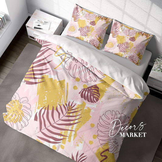 Monstera Tropical Leaves Duvet Cover Set w Pillowcases, Pink Floral Leaves 3D Quilt Cover, 3pc Single Double Queen King Size Doona Cover
