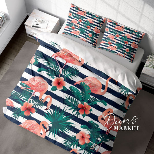 Flamingo Monstera Duvet Cover Set w Pillow Cover, Pink Floral Leaves 3D Quilt Cover, Single Double Queen King Size Doona Cover