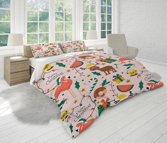 Christmas Flamingo Duvet Cover Set W Pillowcases, Pink Kids Patterns 3D Quilt Cover, 3Pc Single Double Queen King Size Doona Cover