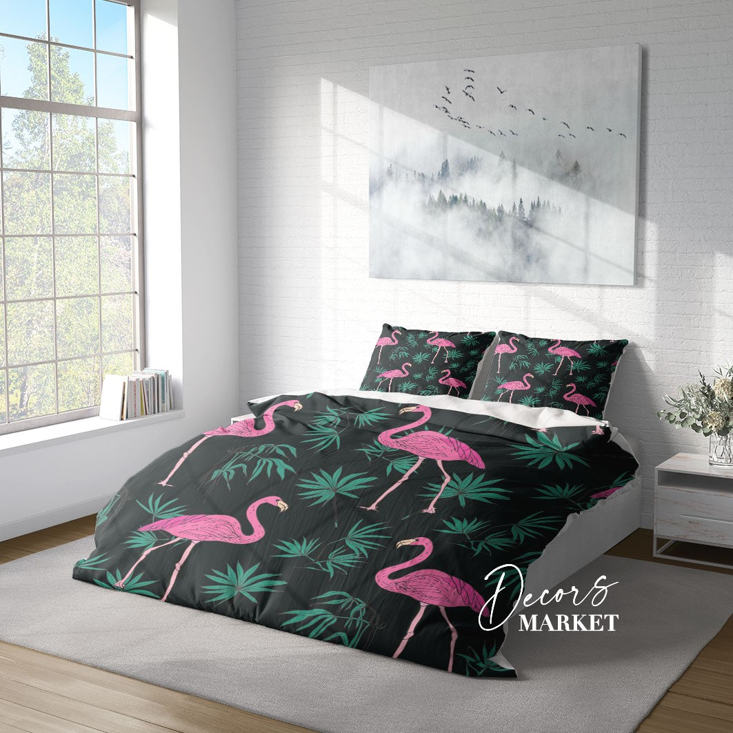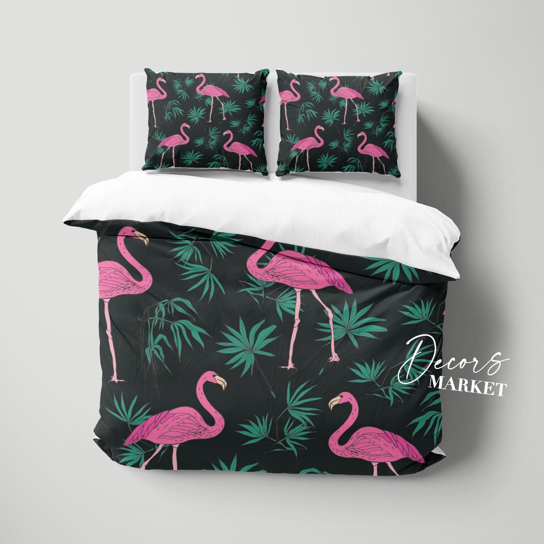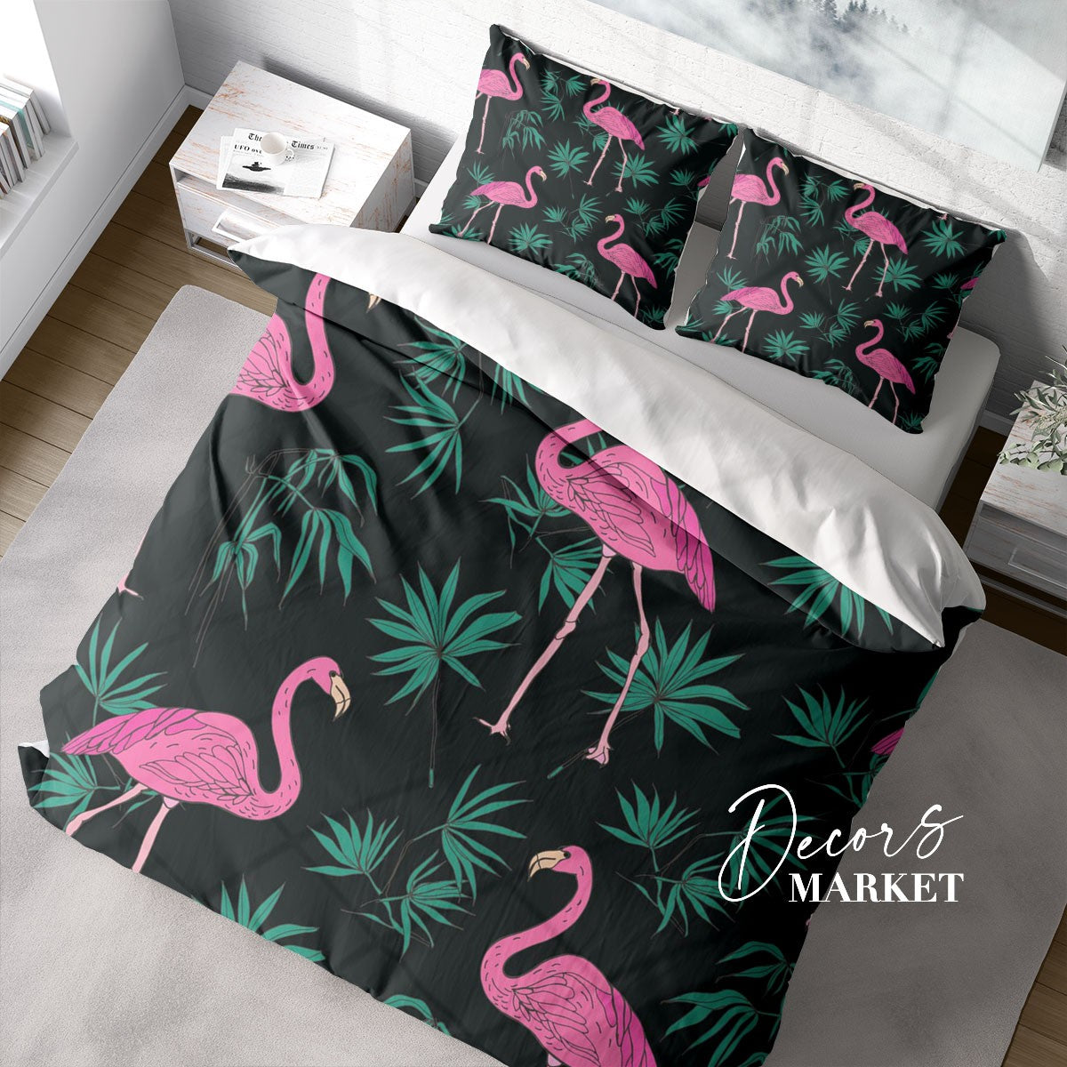 Flamingo Leaves Duvet Cover Set w Pillowcases, Black Pink Floral Patterns 3D Quilt Cover, 3pc Single Double Queen King Size Doona Cover
