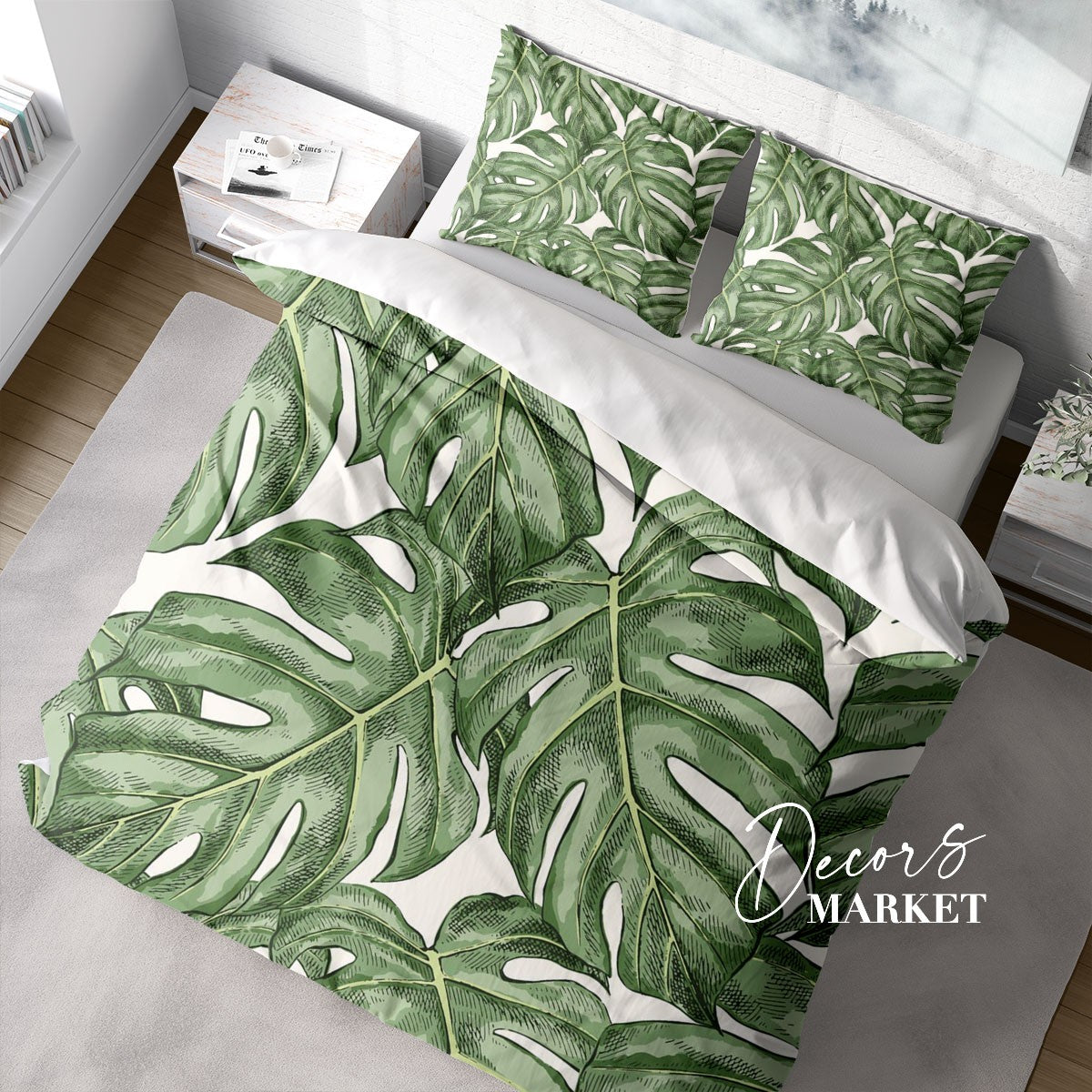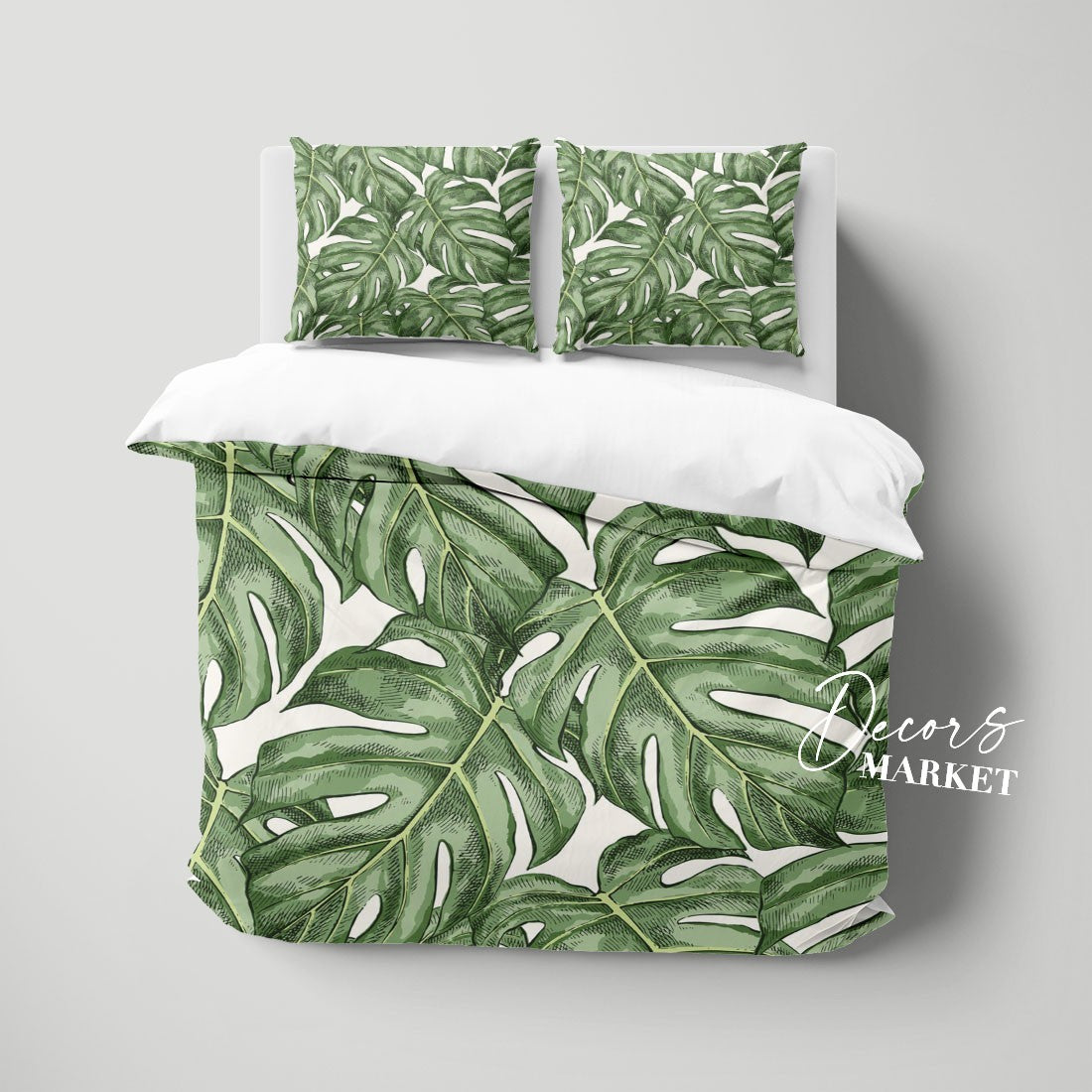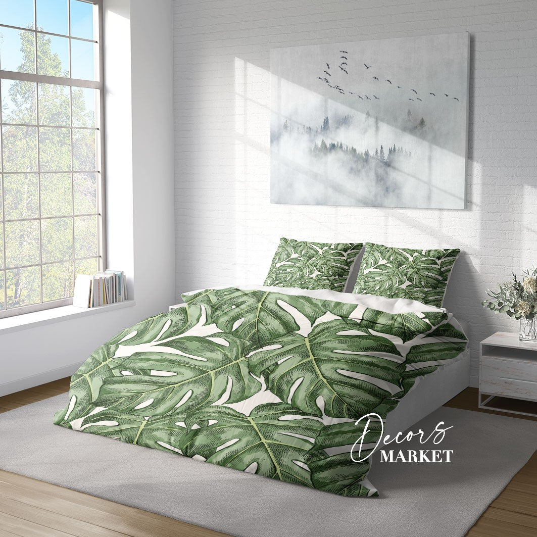 Monstera Leaves Duvet Cover Set w Pillowcases, Green Floral Leaves 3D Quilt Cover, 3pc Single Double Queen King Size Doona Cover