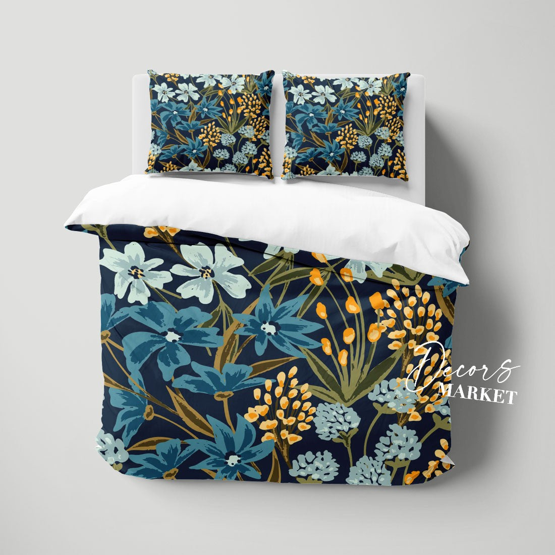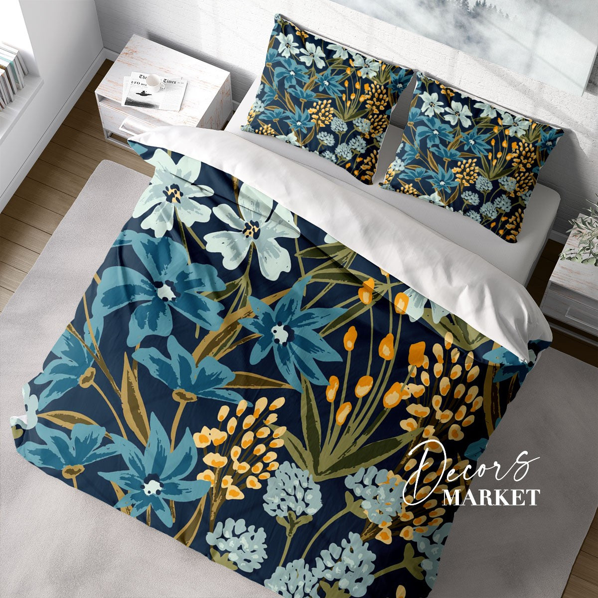 Purple Flower Leaf Art Duvet Cover Set w Pillowcases, Blue Floral Patterns 3D Quilt Cover, 3pc Single Double Queen King Size Doona Cover