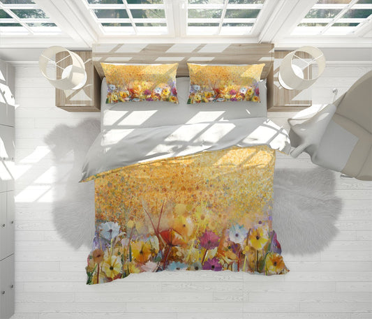 Flowers Painting Floral Yellow 3D Duvet Cover Set W Pillow Cover, Single Double Queen King Size, Printed Cotton Quilt Doona Cover 3 Pcs