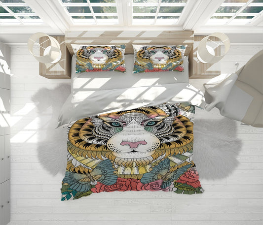 Tiger Flower Duvet Cover Set W Pillow Cover, Multicolour Art Contemporary 3D Quilt Cover, Single Double Queen King Size Doona Cover