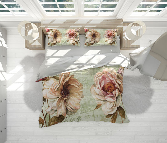 Flowers Art Chinoiserie Neutral 3D Duvet Cover Set W Pillow Cover, Single Double Queen King Size, Printed Cotton Quilt Doona Cover 3 Pcs