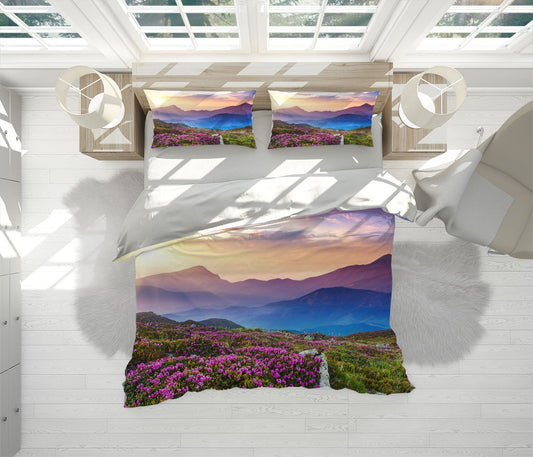 Flower Field Duvet Cover Set W Pillow Cover, Purple Nature Mountain 3D Quilt Cover, Single Double Queen King Size Doona Cover