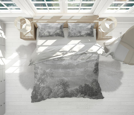 Misty Forest Duvet Cover Set W Pillow Cover, Gray Art Chinoiserie 3D Quilt Cover, Single Double Queen King Size Doona Cover