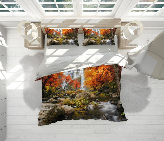 Waterfall Red Leaves Duvet Cover Set W Pillow Cover, Orange Forest Seasons 3D Quilt Cover, Single Double Queen King Size Doona Cover