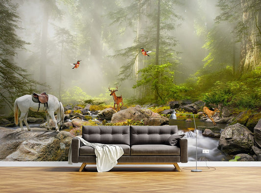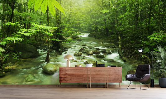 Stream Forest Jungle Green Wallpaper Mural,Self-Adhesive Peel And Stick 3D Wall Decal,Bedroom Designer Wall Decor