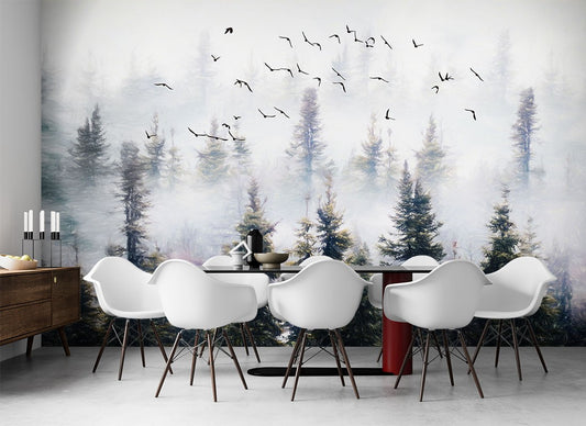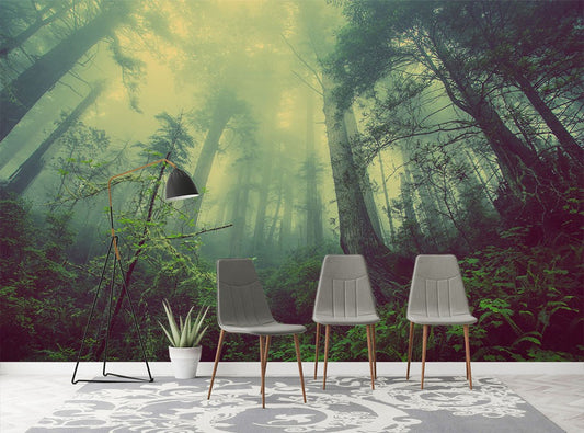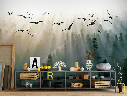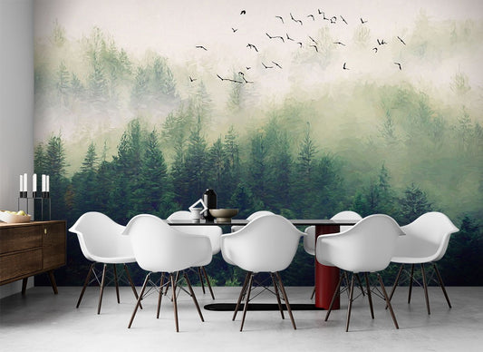 Misty Forest Green Wallpaper Mural,Self-Adhesive Peel And Stick 3D Wall Paper,Removable Designer Wall Decor