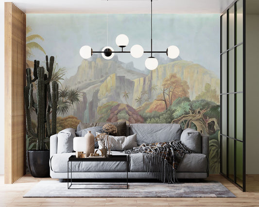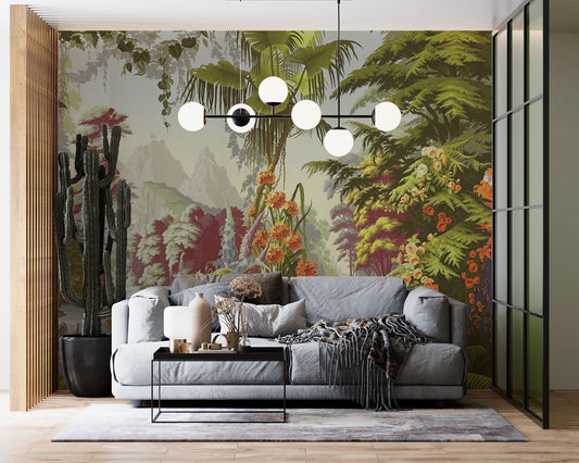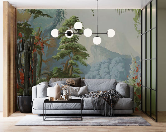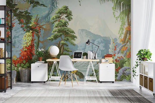 Forest Mountains Floral Leaves Green Wallpaper Mural