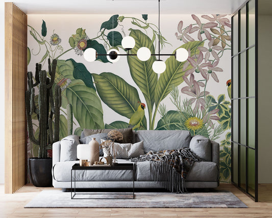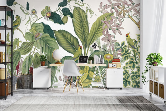 Birds Rainforest Floral Leaves Green Wallpaper Mural