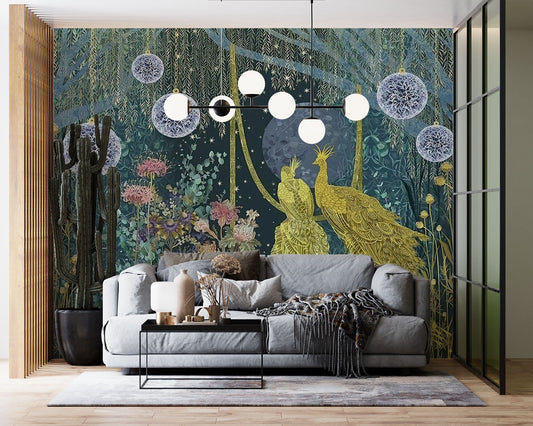 Forest Night Gold Peacock Wallpaper Mural, Trees Forest Green Wallpaper, Self-Adhesive Peel And Stick 3D Wall Mural,Removable Designer Wall Decor