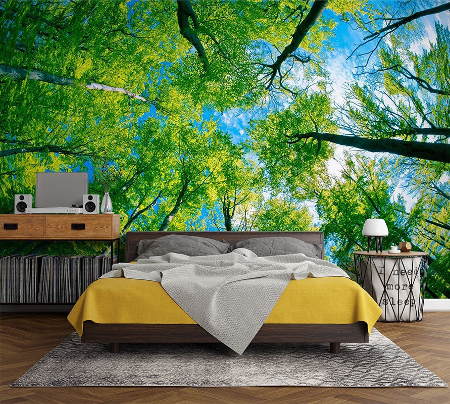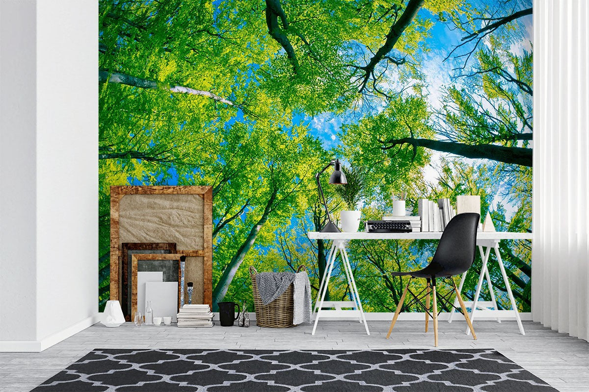 Trees Sky Forest Green Wallpaper Mural,Self-Adhesive Peel And Stick 3D Wall Mural,Designer Removable Wall Decor