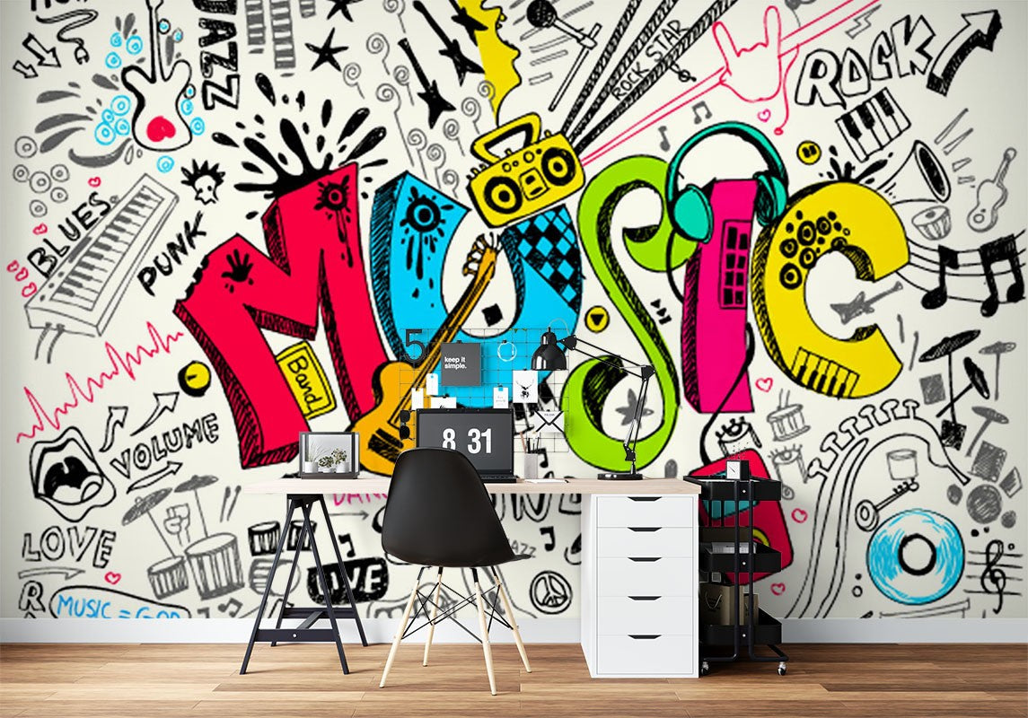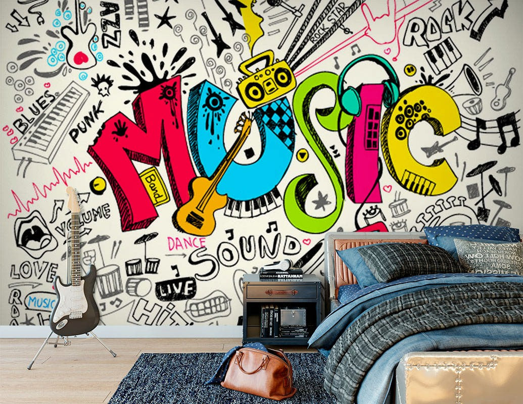 Guitar Music Graffiti Multicolour Wallpaper Mural,Self-Adhesive Peel And Stick 3D Wall Paper,Removable Bedroom Wall Decor