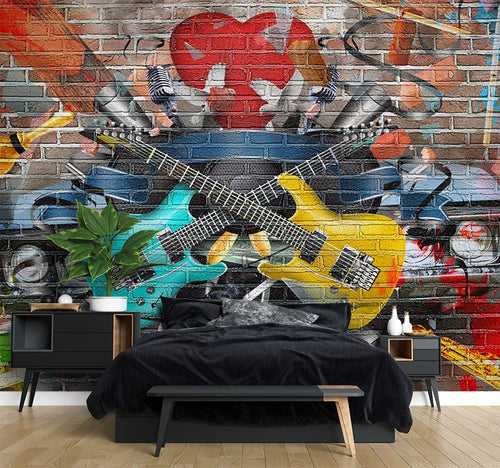 Guitar Music Graffiti Multicolour Wallpaper Mural,Self-Adhesive Peel And Stick 3D Wall Paper,Australian Company Removable Wall Decor