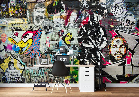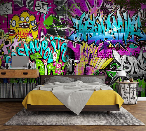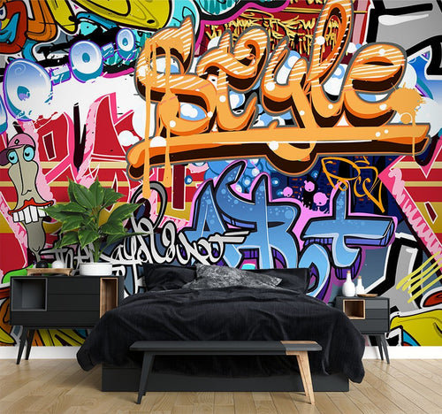Cartoony Characters Graffiti Multicolour Wallpaper Mural,Self-Adhesive Peel And Stick 3D Wall Art,Australian Company Bedroom Wall Decor