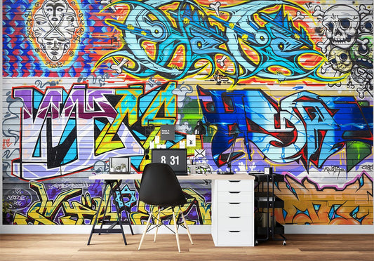 Skull Head Graffiti Multicolour Wallpaper Mural,Self-Adhesive Peel And Stick 3D Wall Decal,Australian Company Removable Wall Decor