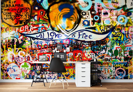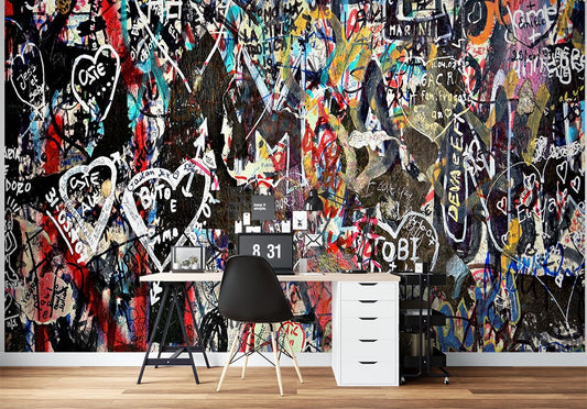 Love Heart Graffiti Multicolour Wallpaper Mural,Self-Adhesive Peel And Stick 3D Wall Decal,Australian Company Wall Decor