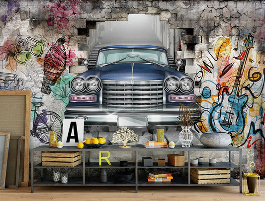 Car Graffiti Multicolour Wallpaper Mural,Self-Adhesive Peel And Stick 3D Wall Decal,Designer Bedroom Wall Decor