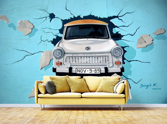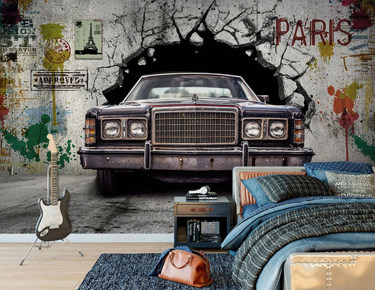 Wall Cracker Vehicle Vintage Car Blue Wallpaper Mural,Self-Adhesive Peel And Stick 3D Wall Decor,Designer Bedroom Wall Decor