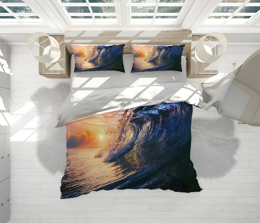 Big Wave Sunset Duvet Cover Set W Pillow Cover, Blue Beach Wave 3D Quilt Cover, Single Double Queen King Size Doona Cover