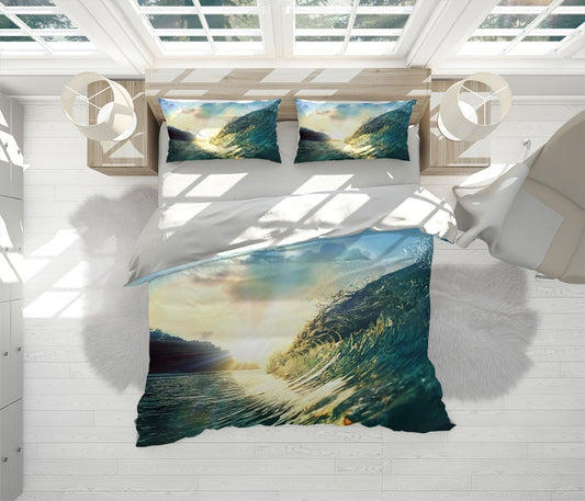 Surge Sunshine Duvet Cover Set W Pillow Cover, Blue Beach Wave 3D Quilt Cover, Single Double Queen King Size Doona Cover