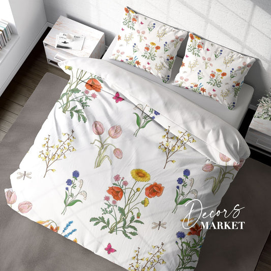 Watercolor Daisy Tulips Duvet Cover Set w Pillowcases, Colorful Floral Flowers 3D Quilt Cover, 3pc Single Double Queen King Size Doona Cover