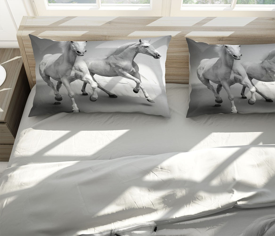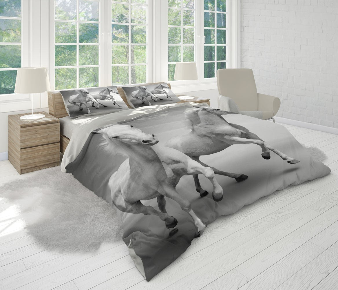 White Horses Duvet Cover Set W Pillow Cover, Black And White Animals Horses 3D Quilt Cover, Single Double Queen King Size Doona Cover