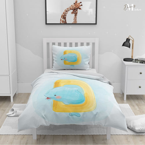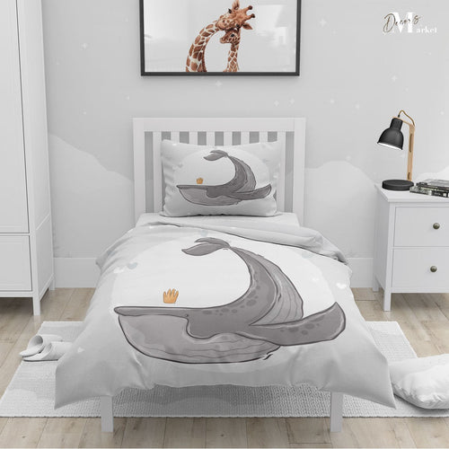 Whale Prince Duvet Cover Set w Pillow Cover, Gray Kids Animal 3D Quilt Cover, Single Double Queen King Size Doona Cover