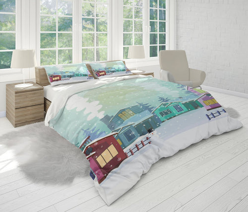 Winter Snow Houses Duvet Cover Set W Pillowcases, Colorful Kids Cartoon 3D Quilt Cover, 3Pc Single Double Queen King Size Doona Cover
