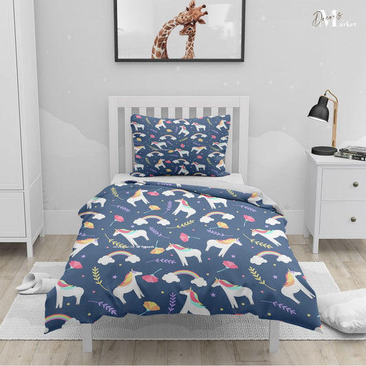 Dream Rainbow Unicorn Duvet Cover Set w Pillowcases, Blue Kids Cartoon 3D Quilt Cover, 3pc Single Double Queen King Size Doona Cover
