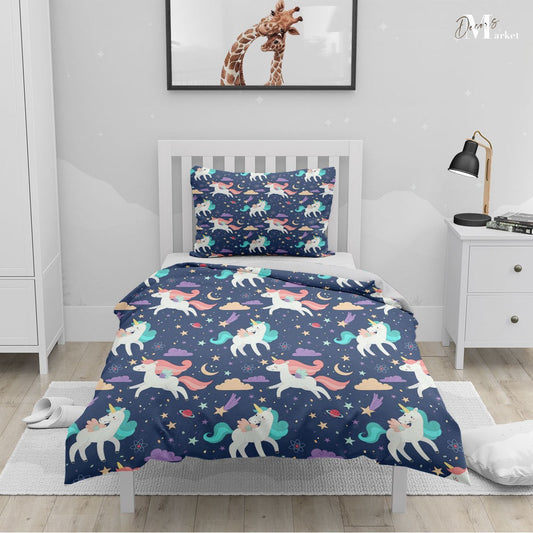 Cute Flying Unicorn Duvet Cover Set w Pillowcases, Blue Kids Patterns 3D Quilt Cover, 3pc Single Double Queen King Size Doona Cover