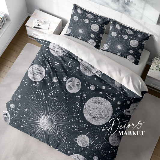 Planet Galaxy Universe Duvet Cover Set w Pillowcases, Black and White Kids Space Quilt Cover, 3pc Single Double Queen King Size Doona Cover