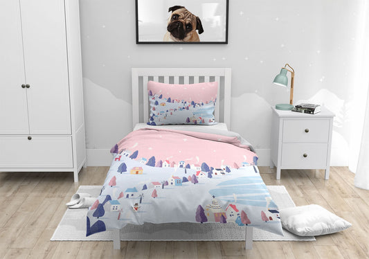 Snow Night Village Duvet Cover Set w Pillowcases, Pink Kids Cartoon 3D Quilt Cover, 3pc Single Double Queen King Size Doona Cover