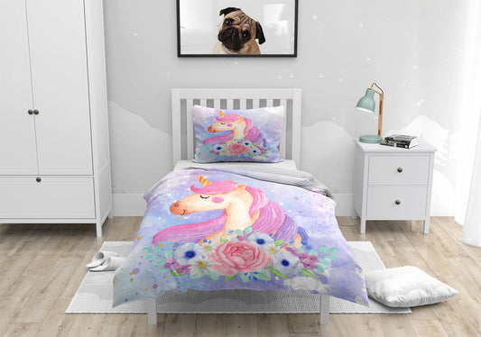 Watercolor Unicorn Duvet Cover Set w Pillowcases, Pink Kids Animal 3D Quilt Cover, 3pc Single Double Queen King Size Doona Cover