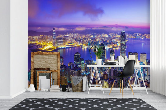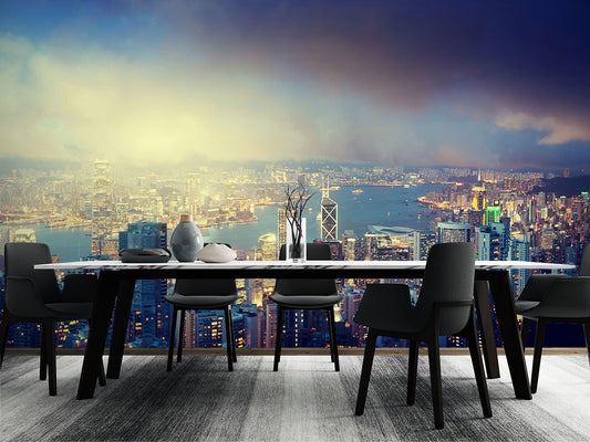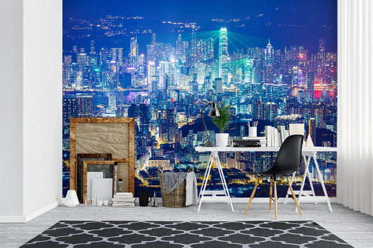 Hong Kong City Landmarks Blue Wallpaper Mural,Self-Adhesive Peel And Stick 3D Wall Decor,Designer Bedroom Wall Decor