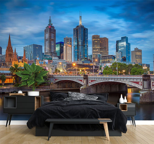 Melbourne Yarra City Landmarks Blue Wallpaper Mural,Self-Adhesive Peel And Stick 3D Wall Decal,Bedroom Australian Company Wall Decor