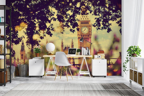 Big Ben City Landmarks Purple Wallpaper Mural,Self-Adhesive Peel And Stick 3D Wall Decal,Designer Bedroom Wall Decor