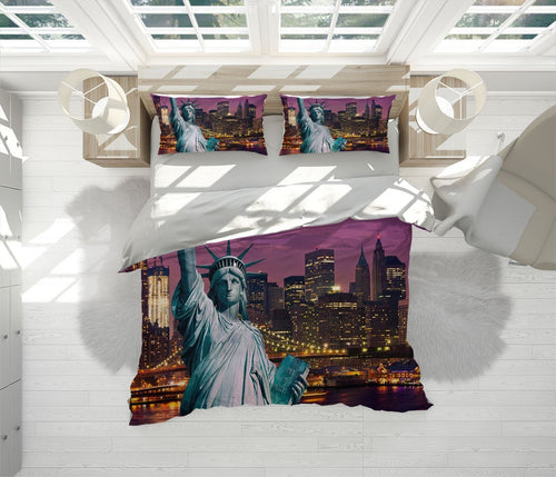 Statue Of Liberty Duvet Cover Set W Pillow Cover, Purple City Landmarks 3D Quilt Cover, Single Double Queen King Size Doona Cover