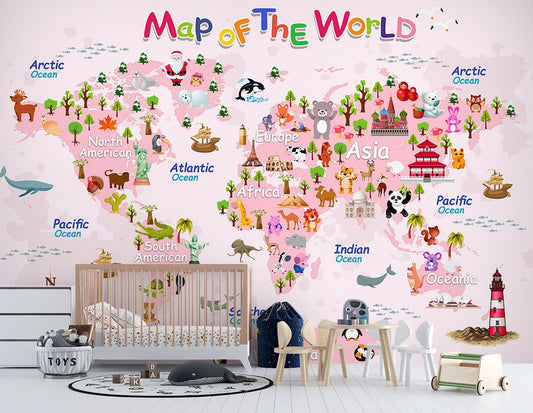 Pink World Map Kids Kids Map Pink Wallpaper Mural,Self-Adhesive Peel And Stick 3D Wall Decal,Bedroom Australian Company Wall Decor