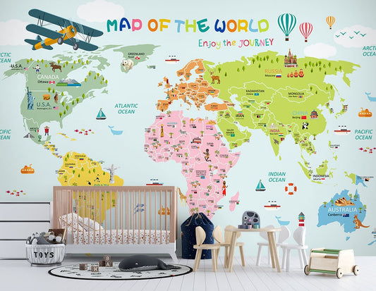 Map Cartoon Kids Kids Map Blue Wallpaper Mural,Self-Adhesive Peel And Stick 3D Wall Decal,Removable Designer Wall Decor