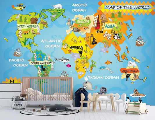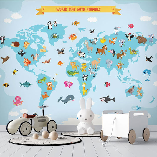 Zoo Intercontinental Kids Map Blue Wallpaper Mural,Self-Adhesive Peel And Stick 3D Wall Art,Australian Company Designer Wall Decor