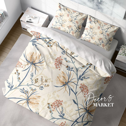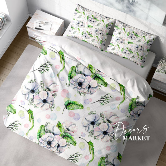 Pastel Botanical Duvet Cover Set w Pillowcases, White Floral Patterns 3D Quilt Cover, 3pc Single Double Queen King Size Doona Cover