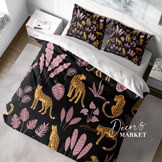 Leopard Leaves Duvet Cover Set w Pillowcases, Big Cat Dark bg Floral Patterns 3D Quilt Cover, 3pc Single Double Queen King Size Doona Cover