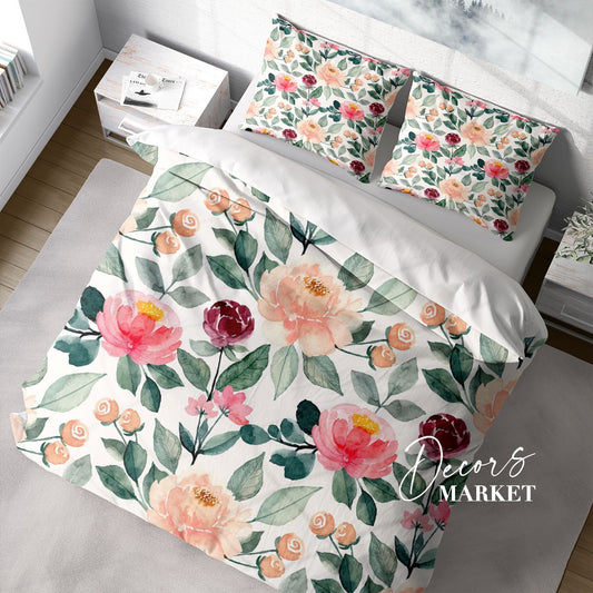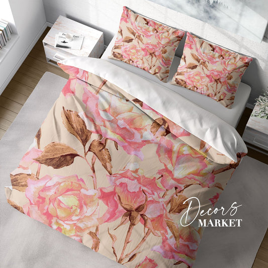Watercolor Garden Roses Duvet Cover Set w Pillowcases, Pink Floral Patterns 3D Quilt Cover, 3pc Single Double Queen King Size Doona Cover