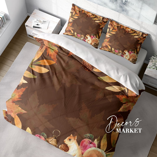 Squirrel Pine Cone Autumn Duvet Cover Set w Pillowcases, Brown Floral Patterns 3D Quilt Cover, 3pc Single Double Queen King Size Doona Cover