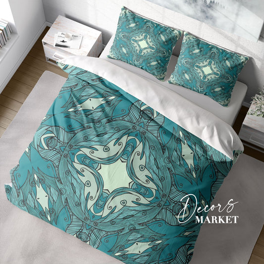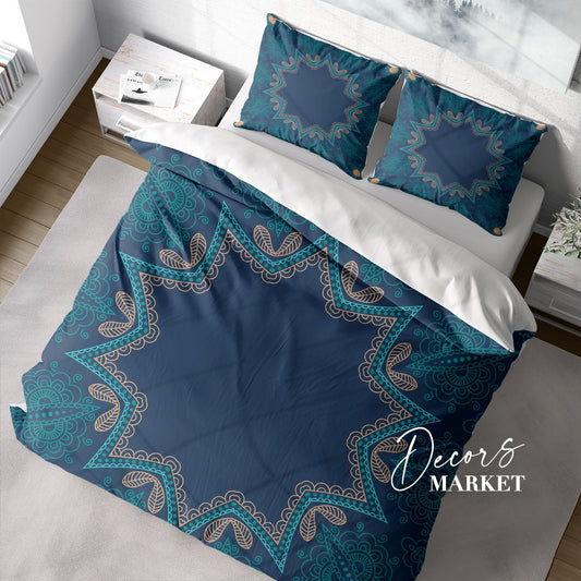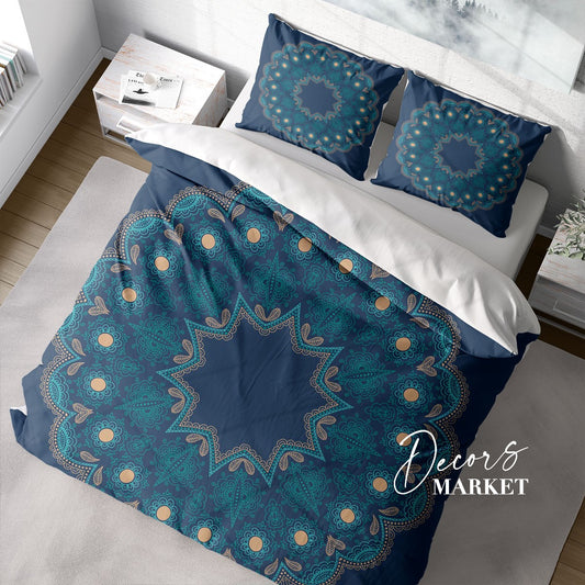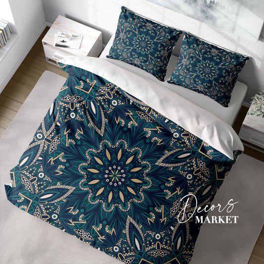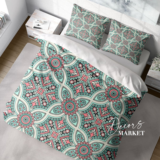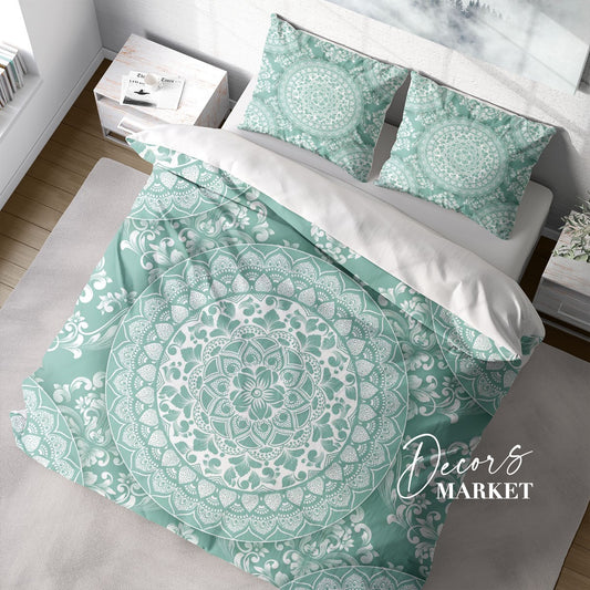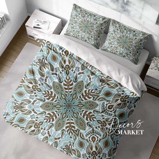 Indian Mandala Duvet Cover Set w Pillowcases, Blue Green Floral Patterns 3D Quilt Cover, 3pc Single Double Queen King Size Doona Cover