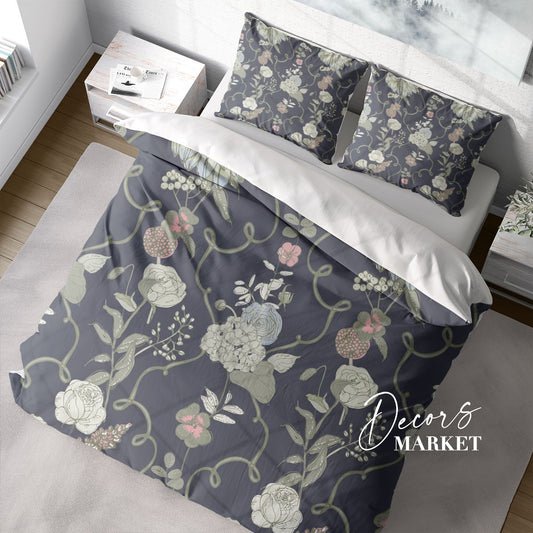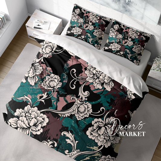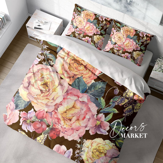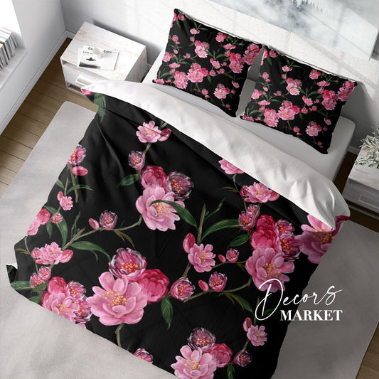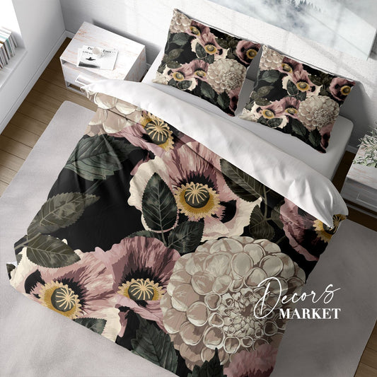 Dark Vintage Flower Duvet Cover Set w Pillowcases, Pink Floral Patterns 3D Quilt Cover, 3pc Single Double Queen King Size Doona Cover