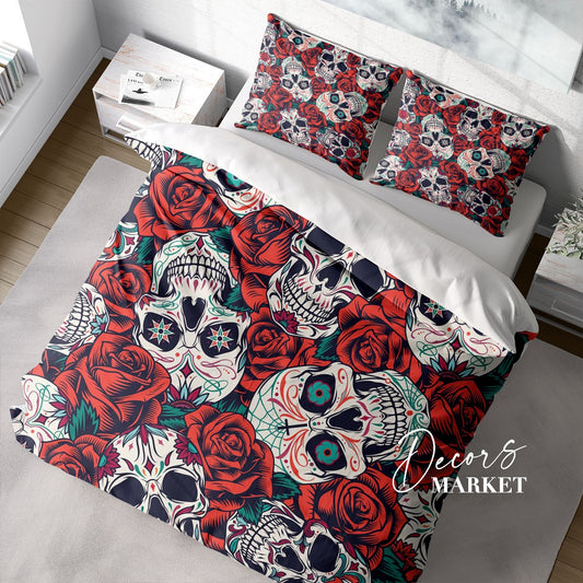 Skull Rose Muertos Duvet Cover Set w Pillowcases, Red Texture Patterns 3D Quilt Cover, 3pc Single Double Queen King Size Doona Cover